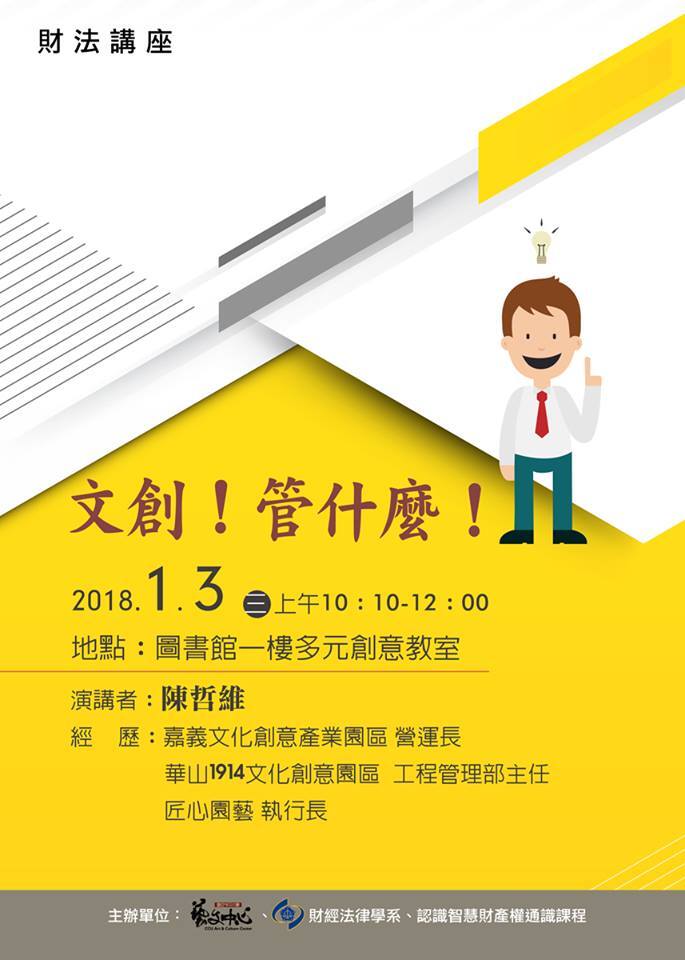 108/11/27 | 吳致緯(戰國策智權股份有限公司協理) | 談談創新創業之商標、專利與品牌 | [海報] |
