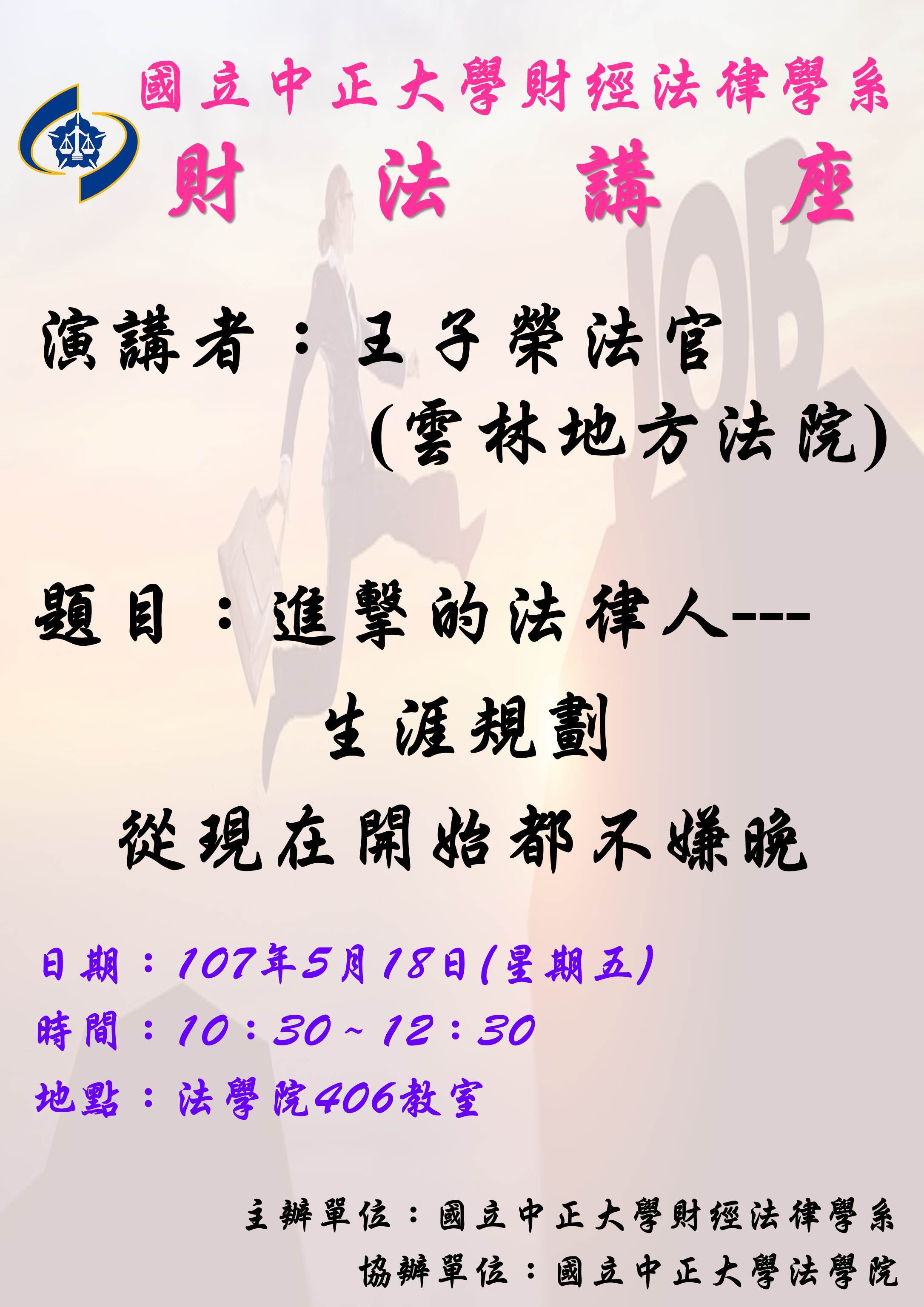 107/05/18 | 王子榮(雲林地方法院法官) | 晉級的法律人---生涯規劃從現在開始都不嫌晚 | [海報] |