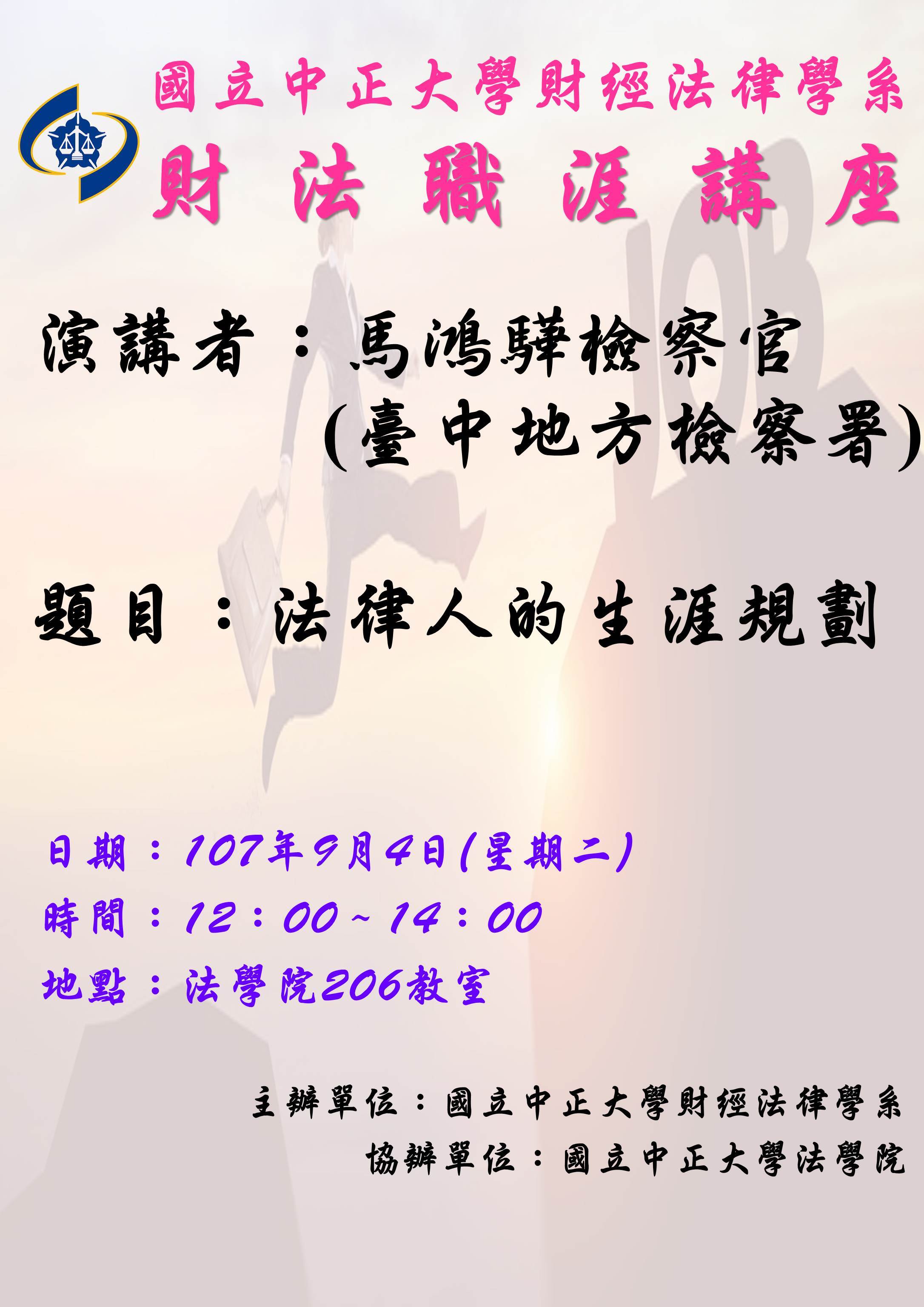 107/09/04 | 馬鴻驊(臺中地檢署檢察官) | 法律人的生涯規劃 | [海報] |