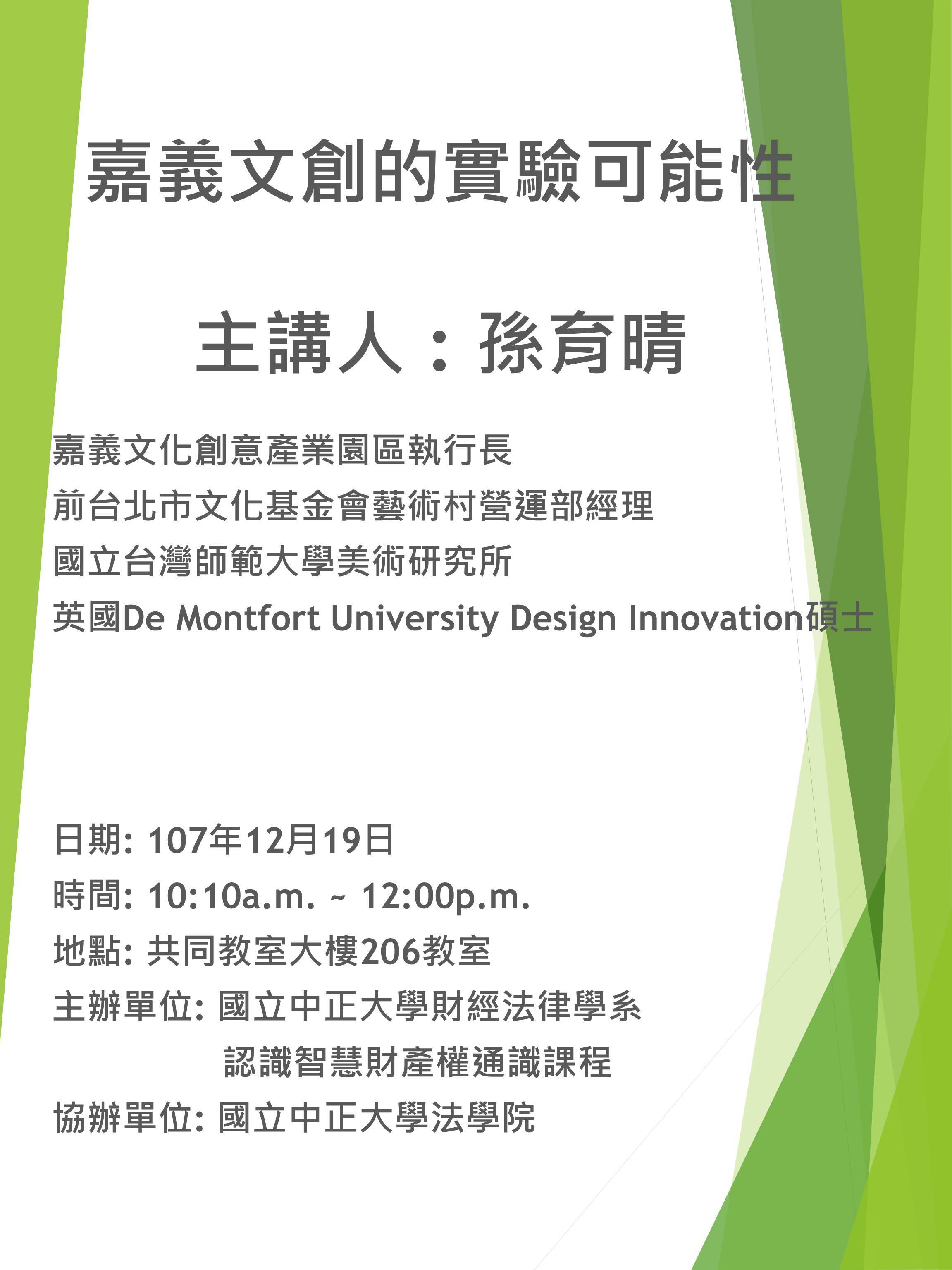 107/12/19 | 孫育晴 (嘉義文化創意產業園區執行長/ 前台北市文化基金會藝術村營運部經理/ 國立台灣師範大學美術研究所/ 英國De Montfort University Design Innovation碩士) |