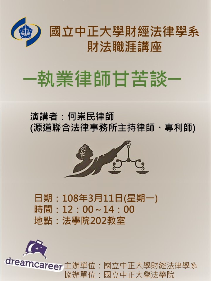 108/03/11 | 何崇民(源道聯合法律事務所主持律師、專利師) | 執業律師甘苦談 | [海報] |
