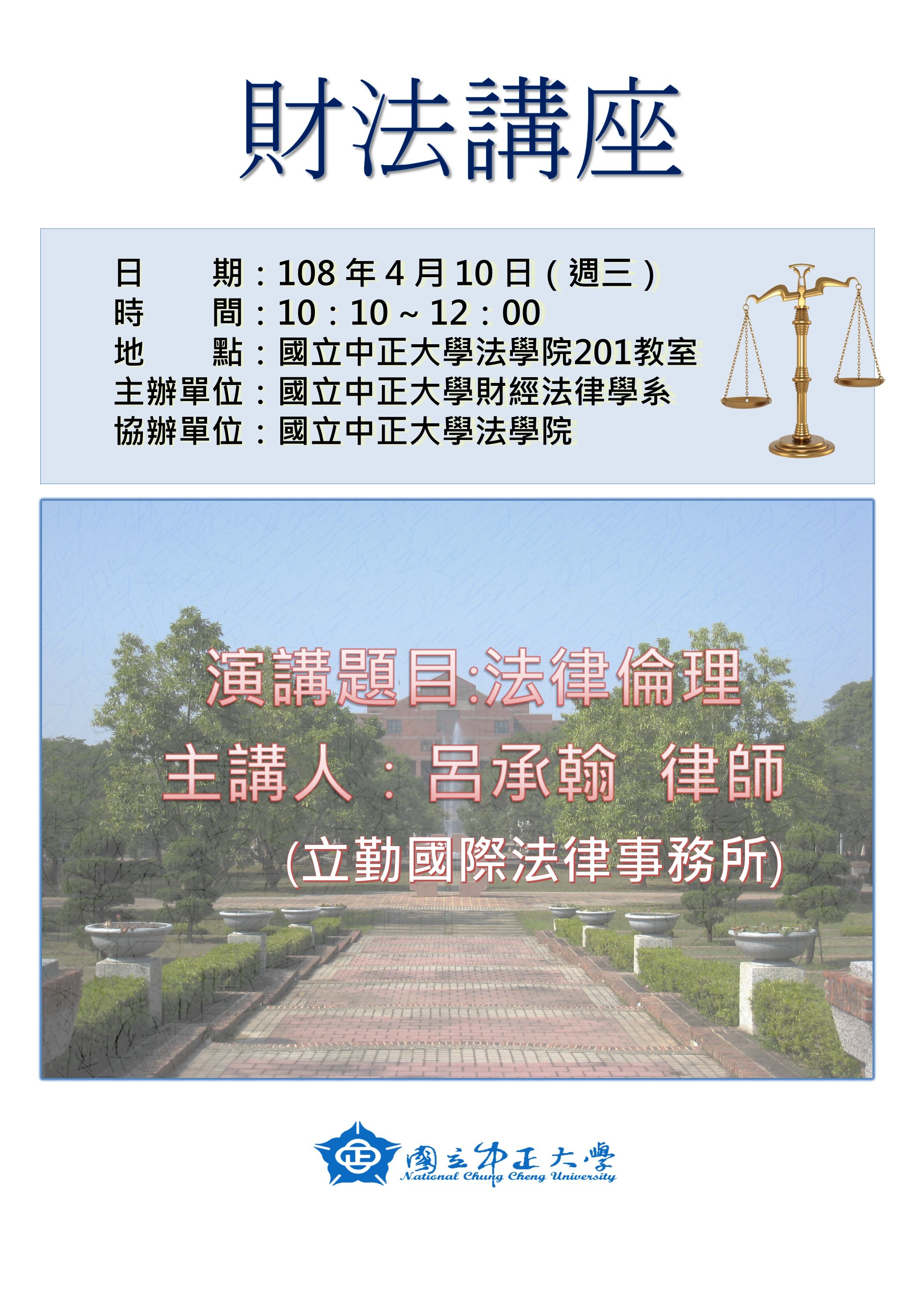 108/04/10 | 呂承翰(立勤國際法律事務所律師) | 法律倫理 | [海報] |
