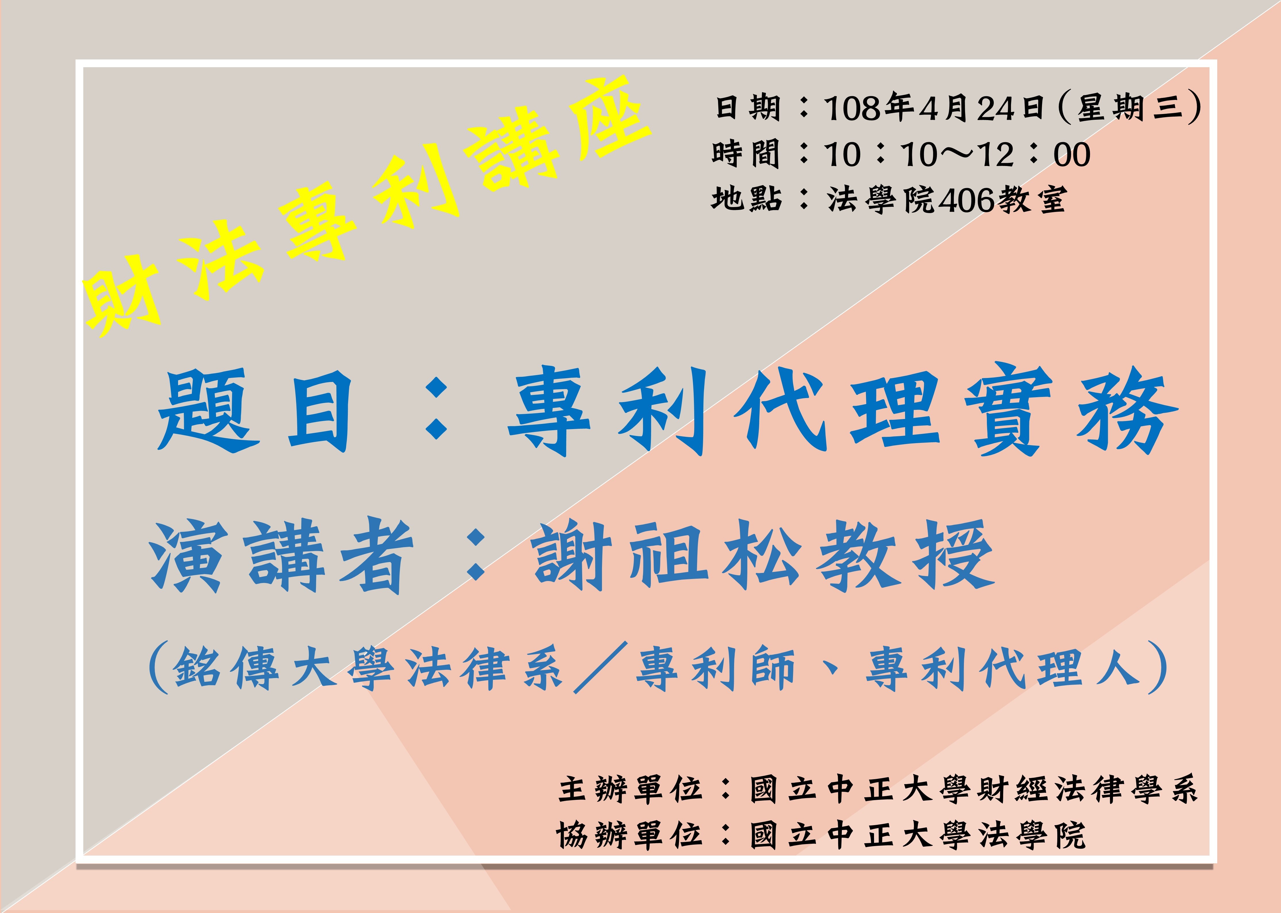 108/04/24 | 謝祖松 (銘傳大學法律系教授/專利師、專利代理人) |