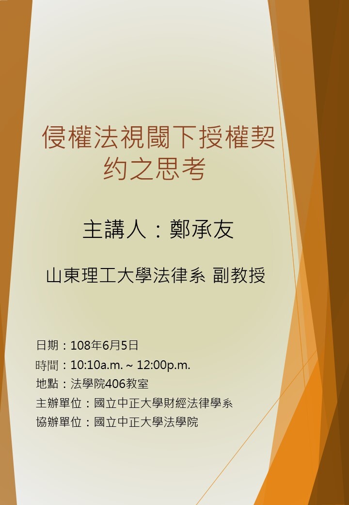 108/06/05 | 鄭承友(山東理工大學法律系副教授) | 侵權法閾下授權契約之思考 | [海報] |