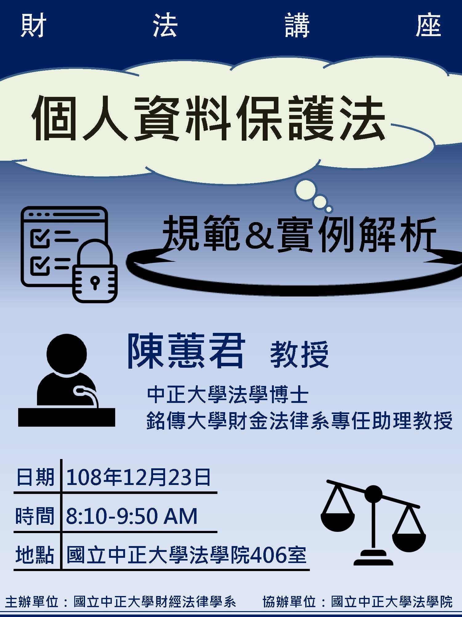 108/12/23 | 陳蕙君(銘傳大學財金法律學系助理教授) | 個人資料保護法-規範&實例解析 | [海報] |