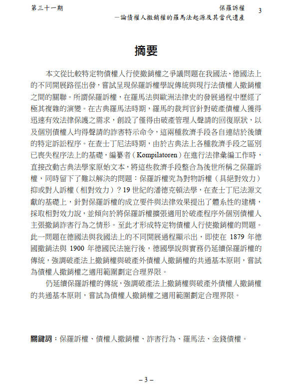 保羅訴權-論債權人撤銷權的羅馬法起源及其當代遺產