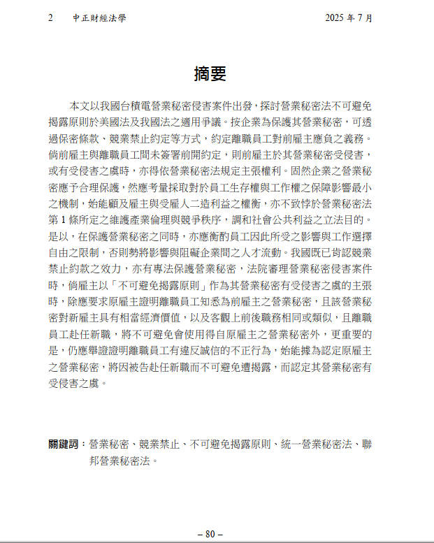 營業秘密法上不可避免揭露原則之探討-由我國台積電案出發