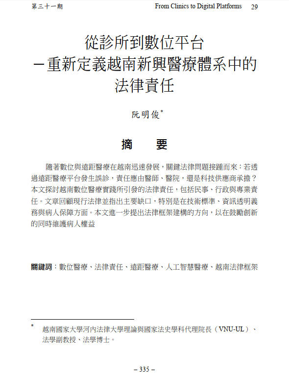 From Clinics to Digital Platforms: Redefining Legal Liability in Vietnam’s Emerging Healthcare System(從診所到數位平台-重新定義越南新興醫療體系中的法律責任)